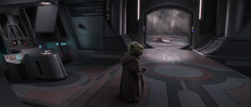 Millenium Falcon.com has posted a new, supposedly leaked photo from "Revenge of the Sith." It is said to contain spoilers, but, unless you have never seen Yoda, I'm not quite sure what is being spoiled. Maybe the cheesy, cartoony, cardboard set where Yoda is standing? "Revenge of the Sith" (trailer) is due out May 2005.